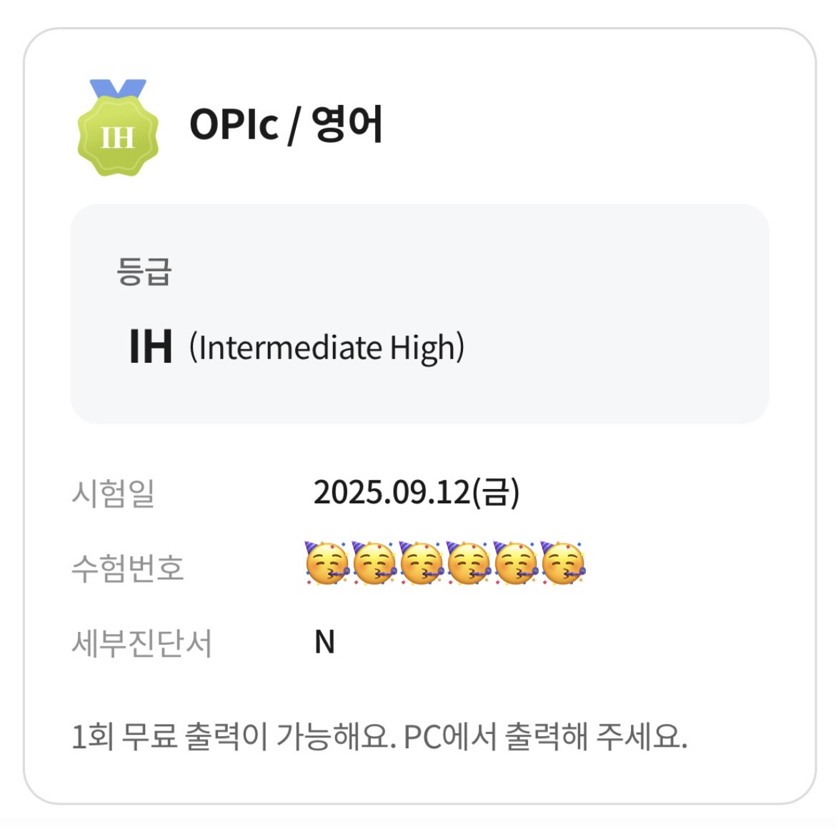그래서 9월에 냅다 오픽을 응시했는데 한 번에 IH라는 성적을 받게 됐습니다. 🥹